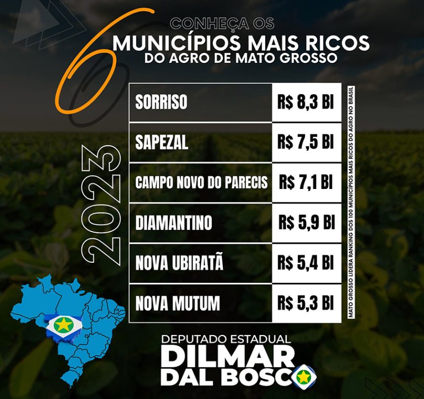 É com grande satisfação que compartilho uma conquista que consolida a posição de Mato Grosso como líder no cenário agropecuário nacional: nosso estado ocupa o primeiro lugar no ranking dos 100 municípios mais destacados do agronegócio em 2023, conforme dados do Ministério da Agricultura e Pecuária, com 36 municípios entre os mais produtivos. Esse resultado não apenas demonstra a solidez de nossa produção agrícola, mas também a resiliência e a expertise de nossos produtores, que sustentam o agronegócio como um dos pilares fundamentais da economia estadual.